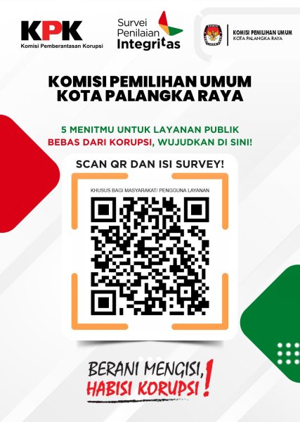 #TemanPemilih, Ayo ikut berperan aktif melawan korupsi! KPU Kota Palangka Raya bersama KPK mengajak Masyarakat untuk berpartisipasi dalam Survei Penilaian Integritas (SPI) 2025. Cukup luangkan waktu 5 menit untuk mengisi survei ini demi mewujudkan layanan publik yang bersih, transparan, dan bebas dari korupsi. Scan QR Code pada gambar untuk langsung mengisi survei. Berani Mengisi, Habisi Korupsi! #KPUMelayani 6 hari ....