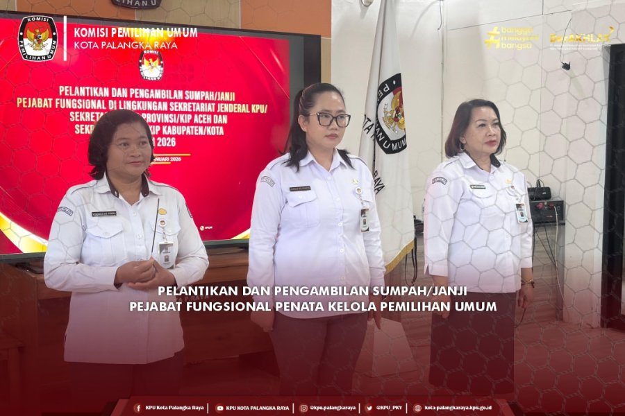 Komisi Pemilihan Umum Kota Palangka Raya melaksanakan Pelantikan dan Pengambilan Sumpah/Janji Pejabat Fungsional Penata Kelola Pemilihan Umum (PKP) yang difasilitasi oleh Sekretariat Jenderal KPU, dan diikuti secara daring di Aula RPP KPU Kota Palangka Raya, Kamis, 22 Januari 2026, pukul 16.00 WIB.
