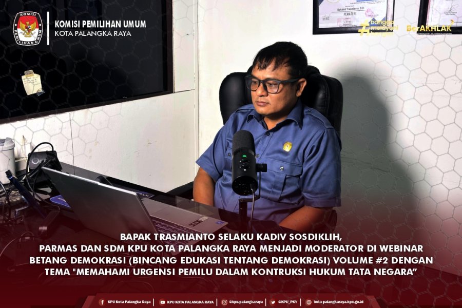Bapak Trasmianto Selaku Kadiv Sosdiklih ,Parmas dan SDM KPU Kota Palangka Raya Menjadi Moderator di Webinar Betang Demokrasi (Bincang Edukasi Tentang Demokrasi) Volume #2 Dengan Tema '' Memahami Pemilu Dalam Kontruksi Hukum Tata Negara''