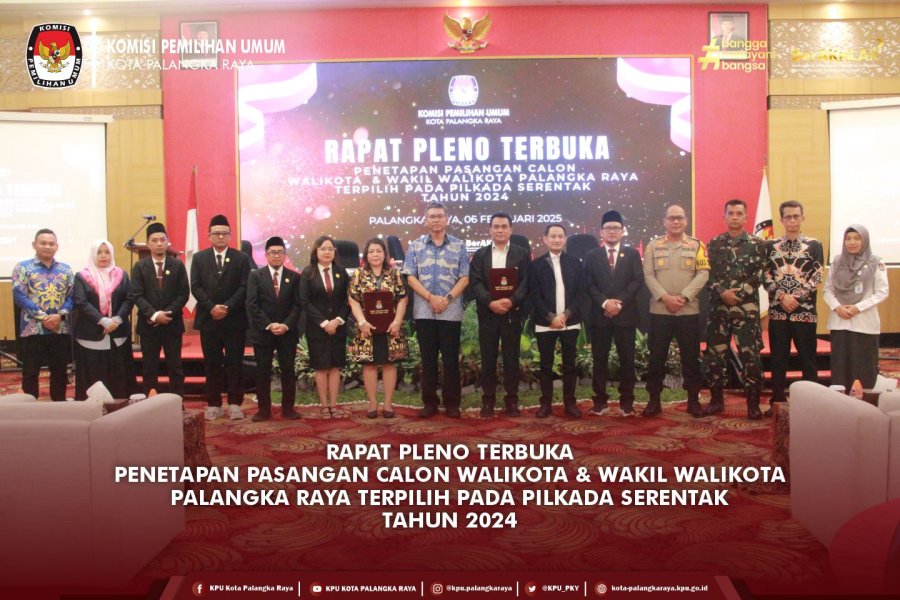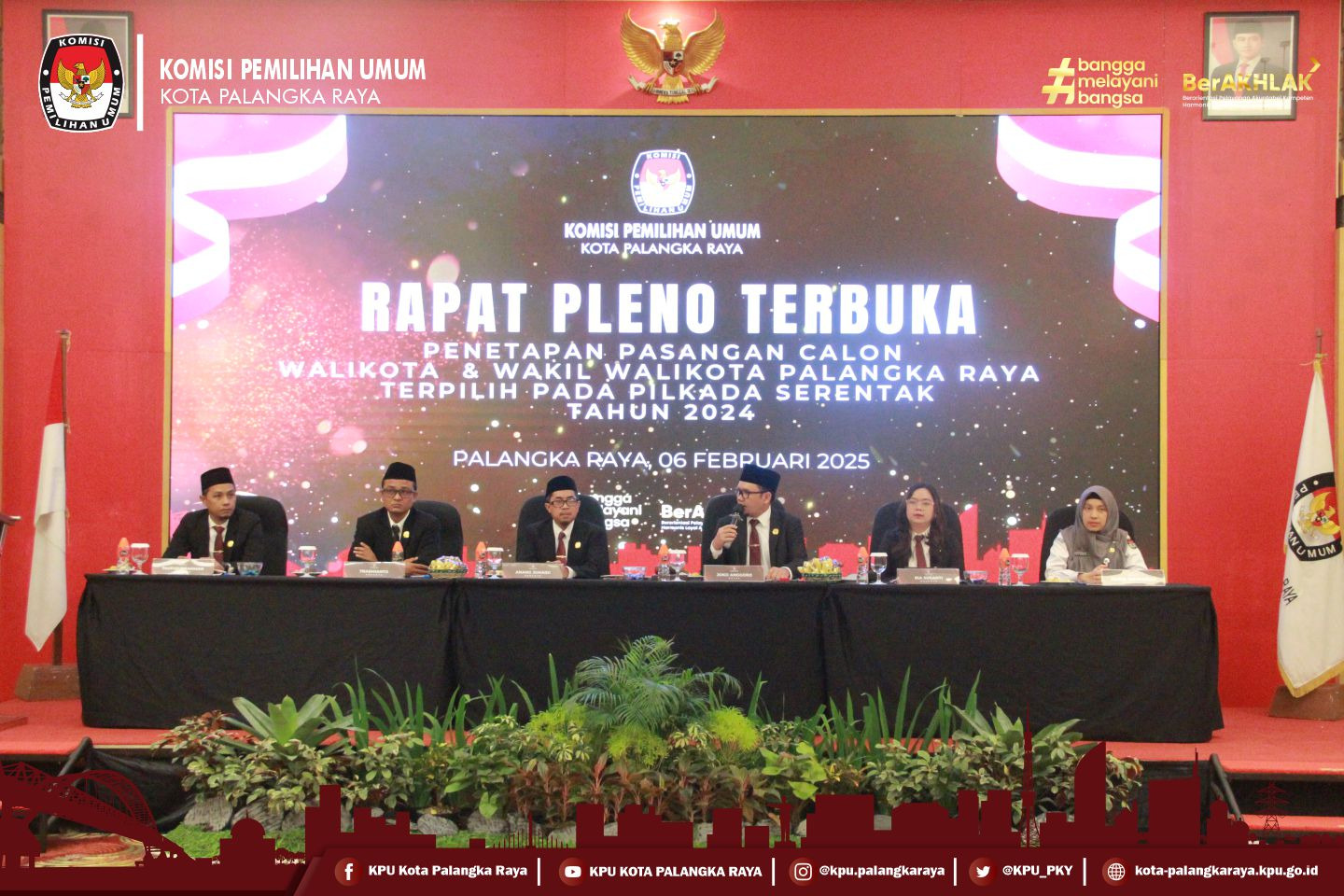 Kepastian ini ditetapkan pada Rapat Pleno Terbuka KPU Kota Palangka Raya, Kalimantan Tengah, Kamis (6/2/2025) yang dituangkan dalam Surat Keputusan KPU Kota Palangka Raya Nomor 2 Tahun 2025, tentang Penatapan Pasangan Calon Wali Kota dan Wakil Wali Kota Palangka Raya Terpilih Tahun 2024.