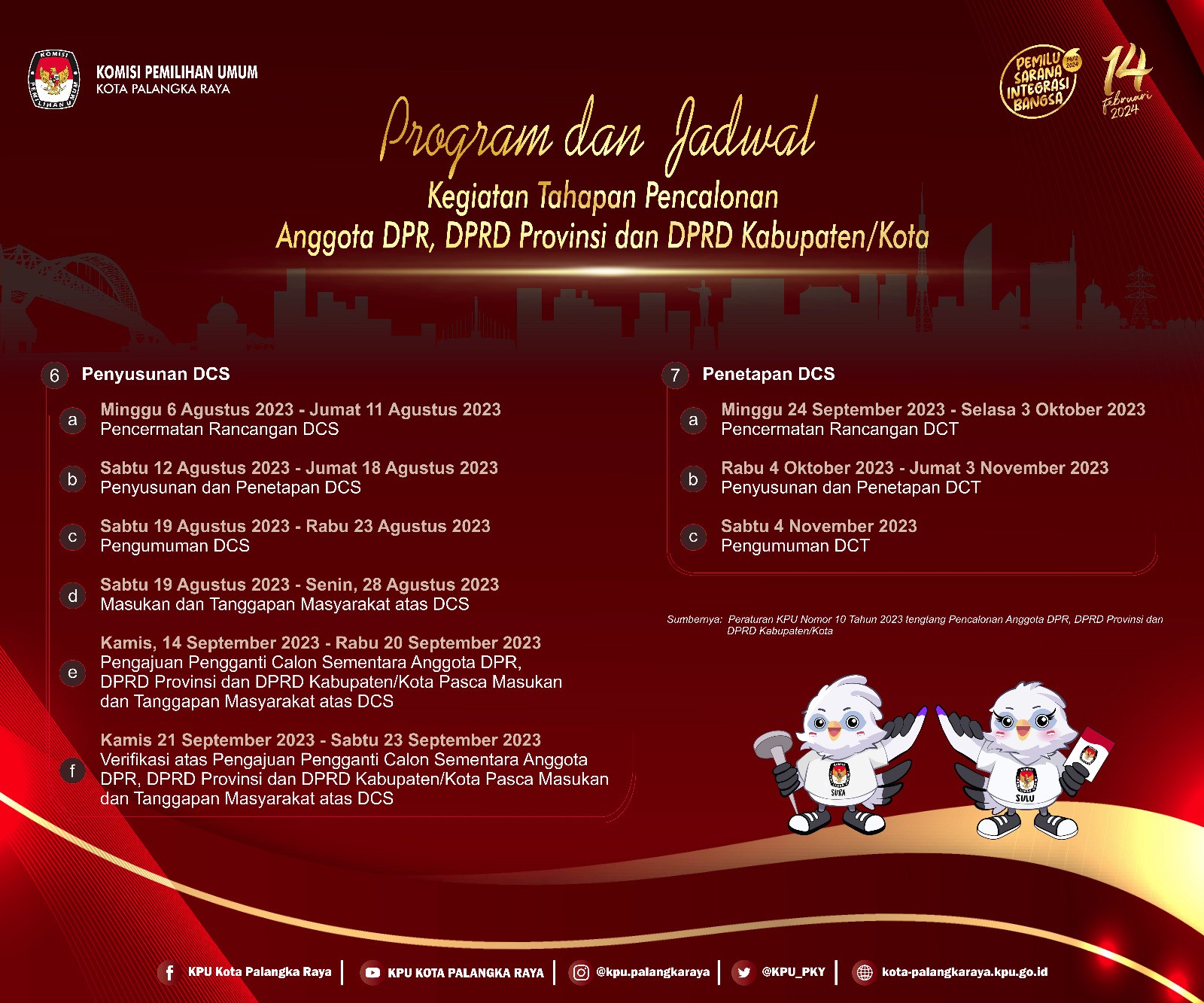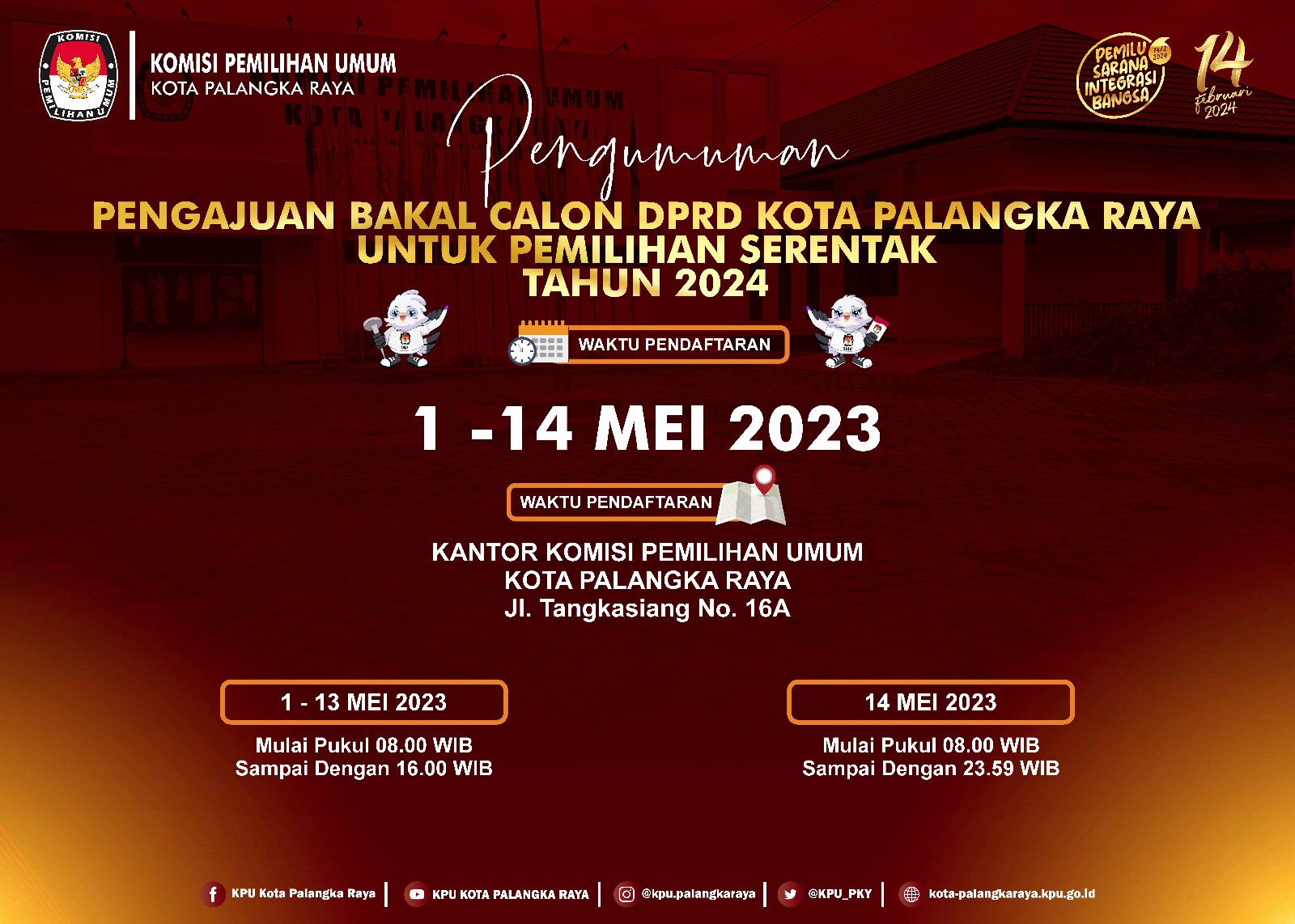 Komisi Pemilihan Umum Kota Palangka Raya membuka penerimaan pengajuan bakal calon anggota Dewan Perwakilan Rakyat Daerah (DPRD) Kota Palangka Raya untuk Pemilu Serentak Tahun 2024 melalui Partai Politik Peserta Pemilu pada kepengurusan tingkat Kota Palangka Raya dengan ketentuan sebagai berikut:
